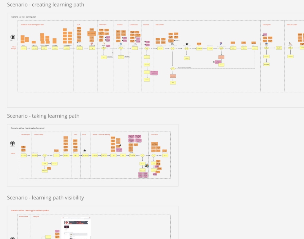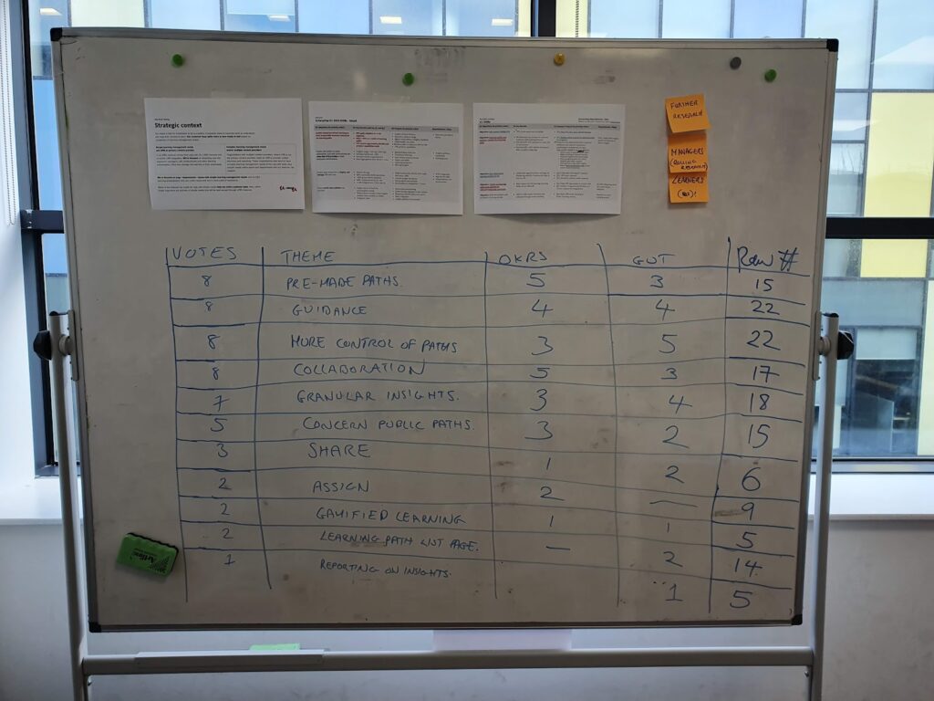 We gathered insights from Productboard, support channels, and interviews, then visualised them on a journey map of the Learning Path editor experience. Working with engineers, product managers, researchers, and customer success representatives, we synthesised pain points, themed insights, and ran a dot-voting exercise to prioritise next steps.